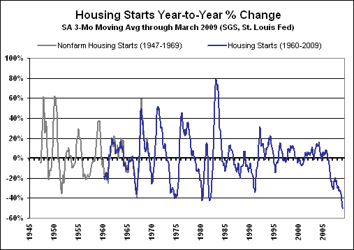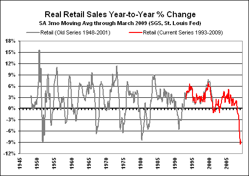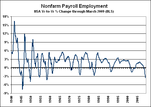 In recent reporting, most key series now have been reported with the worst year-to-year declines since the Great Depression, ignoring the extreme special-circumstance distortions placed on system and the economy by World War II. The exception is nonfarm payroll employment, which was down year-to-year by 3.56% as of March 2009, the weakest showing since July 1958 and the effects of a steel strike.