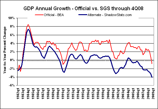 GDP. The alternate fourth-quarter 2008 GDP growth reflects the "final" estimate, with many of the methodological gimmicks of recent decades removed. The alternate fourth-quarter inflation-adjusted annual growth rate (year-to-year, as opposed to the popularly-touted annualized quarter-to-quarter rate) for GDP was a decline of roughly 4.1% versus the official year-to-year contraction of 0.8%. The official, annualized real quarter-to-quarter change stands at a 6.3% contraction. While the quarterly growth number is popularly followed, its significant inaccuracies are expanded to the fourth-power in reporting. The alternate measure safely would have shown an annualized quarterly contraction in the fourth quarter in excess of seven-percent.