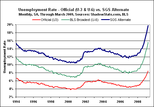 General background note: U.3 is the popularly followed unemployment rate published by the Bureau of Labor Statistics (BLS), while U.6 is the broadest unemployment measure published by the BLS. U.6 is defined as total unemployed, plus all marginally attached workers, plus total employed part time for economic reasons, as a percent of the civilian labor force plus all marginally attached workers. Marginally attached workers include the discouraged workers who survived redefinition during the Clinton Administration. The SGS-Alternate Unemployment Measure simply is U.6 adjusted for an estimate of the millions of old-definition discouraged workers defined away during the Clinton Administration — those who had been "discouraged" for more than one year.