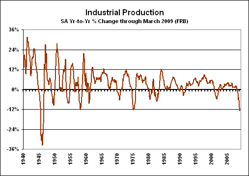 For March 2009, industrial production — the other series plotted back through 1940 — showed its greatest year-to-year decline for any month since the shutdown of war production at the end of World War II. March 2009 production was down 12.8% from the year before.