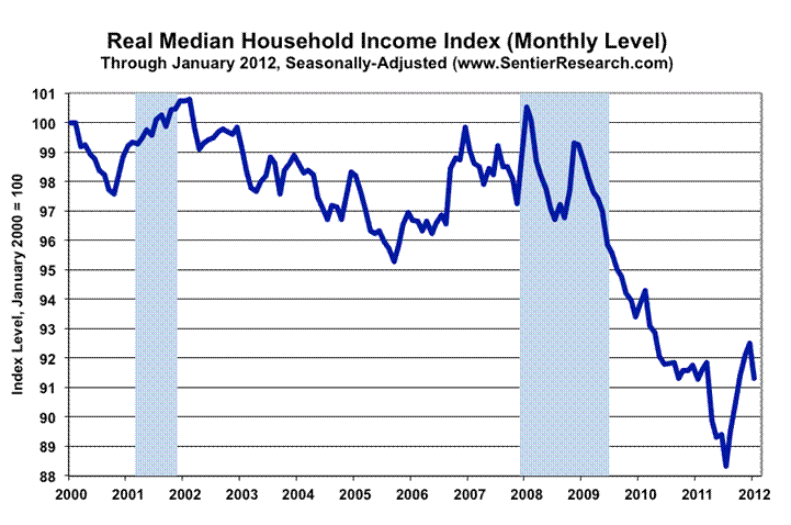 Consumer Liquidity Remains Squeezed. Despite “improved” labor numbers, the consumer remains in an extraordinary liquidity bind. Updated data from SentierResearch.com showed a renewed decline in median household income as of January 2012 (adjusted for CPI-U inflation) per the accompanying graph.
