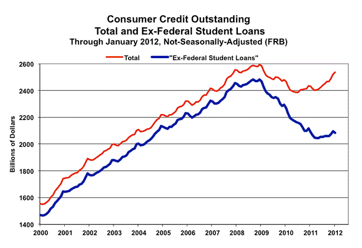 As shown in the following graph, virtually all of the growth in consumer credit outstanding has been in federal student loans, not in bank lending to consumers that could be used to make up the shortfall in declining living standards. Bank lending generally remains impaired, due largely to ongoing banking-system balance-sheet problems. Although there has been some pick-up in commercial and industrial loans, total credit market debt outstanding (net of Uncle Sam) has not been growing.