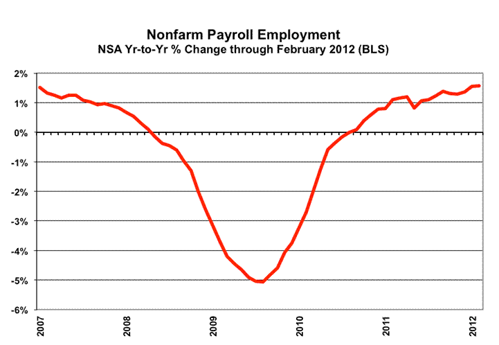 The following graphs of year-to-year unadjusted payroll change had shown a rising trend in annual growth through 2010, which primarily reflected the still-protracted bottom-bouncing in the payroll series. That pattern of growth flattened out in 2011, as shown in the first graph of the near-term detail in year-to-year change. The January and February 2012 numbers have shown somewhat higher relative growth, a circumstance that likely will be short-lived.