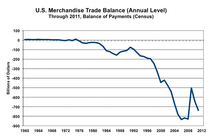 Nominal (Not-Adjusted-for-Inflation) Trade Deficit. In the context of major revisions to nominal and real trade data, the Bureau of Economic Analysis (BEA) and the Census Bureau reported today (March 9th) that the 2011 the annual trade shortfall in goods and services, on a balance of payments basis, widened to a revised to $560.0 (previously $558.0 billion), from $500.0 billion in 2010, and from $381.3 billion in 2009. On the goods side, the 2011 merchandise trade deficit widened to a revised $738.3 (previously $737.1) billion, from $645.9 billion in 2010, and from $505.9 trillion in 2009. The merchandise detail has a relatively hard paper trail behind its reporting. On the services side, the 2011 surplus was reduced to a revised $178.3 (previously $179.0 billion), but up from $145.8 billion in 2010, and from $124.6 billion in 2009. The services series largely is guessed at, with supporting documentation of limited accuracy. The revised details on an annual basis for the merchandise trade deficit are graphed.