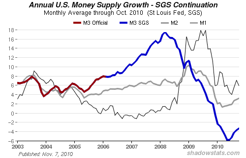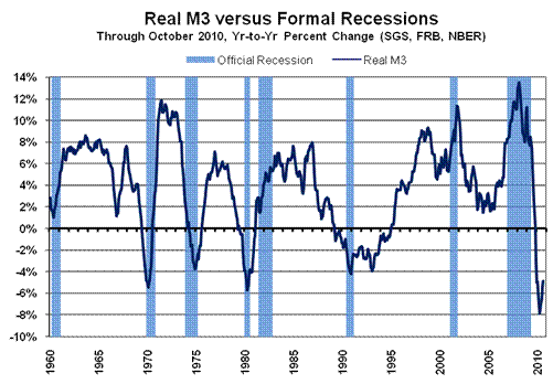 The following updated graph plots annual real M3 growth versus periods of recession formally recognized by the NBER. It includes an approximate annual real contraction in the SGS Ongoing-M3 Estimate as of October 2010. The inflation-adjusted October M3 estimate used here is an annual contraction of roughly 4.6%, versus a 4.9% contraction in September.