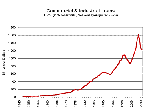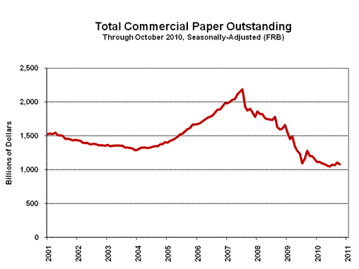 Yet, as just discussed, the Fed’s ability to stimulate inflation usually is not tied to commensurate growth in the economy, and Mr. Bernanke is a good enough economist to know that. He also was painfully aware of the global criticism his actions would draw. So, why did the Federal Open Market Committee announce on November 3rd that it would monetize nearly one trillion dollars of U.S. Treasury debt ($600 billion new buying and $250 to $300 billion in reinvested mortgage-backed securities), buying enough U.S. Treasury notes through mid-2011 to cover the total anticipated borrowing needs of the U.S. government for the same period? Perhaps the Fed did not want to worry about there being enough foreign investment to fund the government’s operations? More likely, the action was aimed at trying to front-run an intensifying systemic liquidity crisis that has been smoldering for the last couple of years — never extinguished — and that has been reignited in an economic environment of continued downturn and turmoil. As shown in the above graph, the SGS-Ongoing M3 Measure continues to show year-to-year contraction (down 3.4% in October), although the pace of decline has narrowed, as the broad money measure has seen slow month-to-month growth recently, against monthly contractions a year ago. Nonetheless, the indication here remains one of ongoing systemic instability, particularly in the banking system. Please note the following graphs on the monetary base. Broad money did not grow in response to the surge in excess bank reserves from prior "quantitative easing," largely because the banks did not lend the money into the normal stream of commerce, which would have spiked the money supply. Also the bulk of prior "quantitative easing" was in the purchase of mortgage-backed securities. The monetary base is not a money supply measure, per se; it consists of bank reserves (not counted in any money supply measures) and currency in circulation (in money supply M1). It still is, in theory, the Fed’s primary tool for adjusting the money supply. The graphs show roughly what the monetary base would look like by mid-2011, given the promised stimulus. While there is no guarantee that banks will increase their lending — part of the restraint still seems to be balance-sheet issues with certain banks — the nature of the Fed buying so much in the way of Treasuries from banks or otherwise should be enough to have some minimal flow-through to the money supply. As shown in the following graphs, bank lending to consumers and businesses remains abysmal, although the monthly declines have flattened out in the latest monthly reporting. In the area of commercial paper outstanding, after short-lived small bumps, both the aggregate (shown) and nonfinancial outstandings again have turned down. The Fed’s primary function — as a private corporation owned by commercial banks — is to protect the banking system. Supporting economic growth and containing inflation are secondary concerns, but the renewed economic threat now also can shatter the fragile appearance of banking-system stability. Indeed, the banking system is far from stable, which is one reason lending is down and likely is the primary reason the Fed has launched its new program.