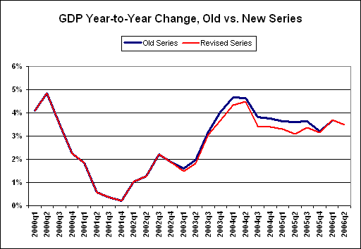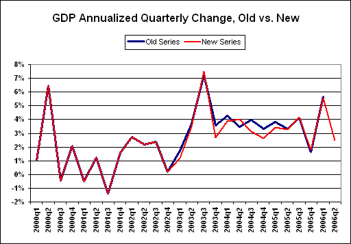 The "advance" estimate of annualized seasonally-adjusted real (inflation-adjusted) growth in second-quarter 2006 Gross Domestic Product (GDP) was reported at a below-consensus 2.5%, down from the first quarter's unrevised 5.6%. Due to an unconscionable manipulation of the inflation data, those results masked a quarterly contraction that likely was in excess of 0.5%. A contraction would be consistent with the current, though officially unrecognized, recession. Please note that this contraction is before any adjustment for the upside methodological biases built into existing GDP reporting.