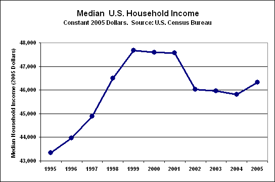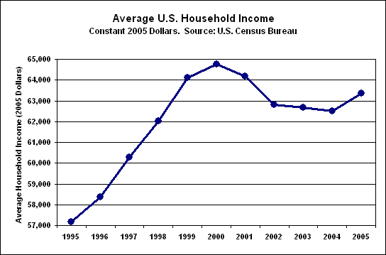 Also reported in the poverty report were estimates of inflation-adjusted average and median (meaning the middle measure) household income levels for 2005. Of some note, as shown in the graphs below, both average and median household income contracted each year from 1999/2000 through 2004, with a suspect rebound in 2005. The earlier years are consistent with data from the Internal Revenue Service. Reality for 2005 eventually will come from IRS reporting.