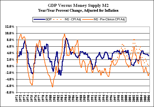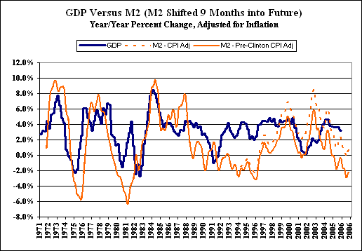 The second graph is the same as the first, except the plot of M2 growth has been moved, shifted nine months into the future against the GDP, so as to show the best correlation with GDP. Slowing M2 growth in the second graph — that already has taken place — suggests that annual real GDP growth is going to slow for at least the better part of 2006.