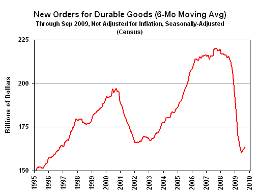 From the durable goods orders series peak in 2006, the September 2009 order level was down by 28.1%, within great depression territory per SGS definition of a greater than 25% peak-to-trough decline in economic activity. Since January 2009, the seasonally-adjusted series has flattened out at an extremely low level, averaging $162 billion per month. Against that, the September reading of $165.7 billion was within the normal range of volatility for reporting of this series.
