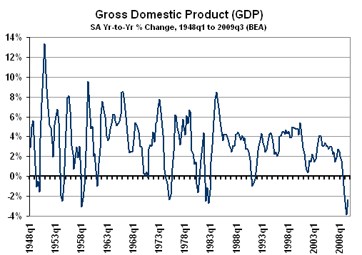 GDP Set for Renewed Contraction Next Quarter. The "advance" guesstimate for third-quarter 2009 Gross Domestic Product (GDP) released this morning (October 29th) by the Bureau of Economic Analysis (BEA) suggested annualized real growth for the quarter of 3.53% +/- 3% (95% confidence interval), following a 0.74% decline reported for the second quarter.