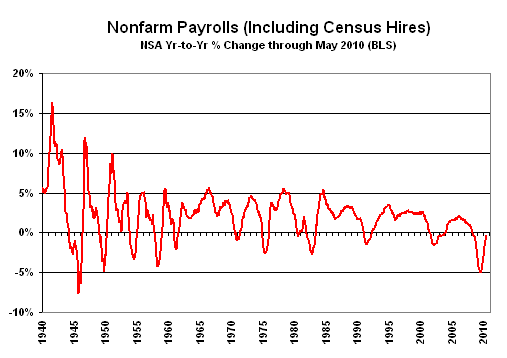 The long-term graph of year-to-year payroll change reflects the numbers as reported, with no adjustment for census hiring. The second graph, however, shows the year-to-year detail both with and without the census hires.