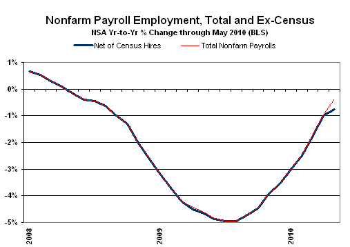 Based on the patterns of hiring and firing temporary workers for the 2000 census, layoffs from the 2010 census will begin meaningfully in June 2010, with next month’s total payroll reporting very likely to show a large jobs loss as a result. Payrolls likely will be in monthly contraction, as well, net of census discharges.