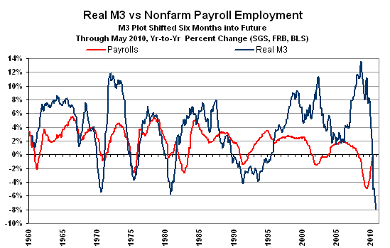 Signal Continues to Intensify for Renewed Economic Downturn. As discussed in recent Commentaries (see Commentary No. 296, for example), declining year-to-year change in real (inflation-adjusted) M3 signals a pending economic downturn or pending intensification of an existing economic contraction, with contracting broad liquidity invariably constraining broad economic activity. The following updated graph reflects both the annual payroll change and the approximate annual real contraction in the SGS Ongoing-M3 Estimate as of May 2010. The M3 plot is shifted forward on the time scale by six months so as to show the leading relationship of its annual contractions to payroll activity. The May M3 estimate is an annual contraction of roughly 7.9% versus a 7.0% contraction in April. Details will be discussed in the next Commentary (June 7th), which will be dedicated to the money supply circumstance. The formal preliminary estimate for the SGS Ongoing M3 Measure for May will be posted this weekend on the Alternate Data page for M3.