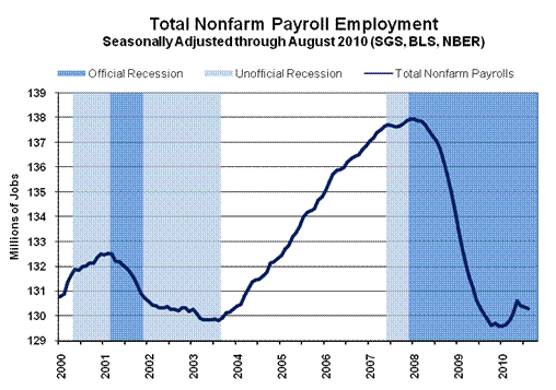 Graphs. The first of the following graphs shows the seasonally-adjusted monthly level of payroll employment since 2000, with no adjustments made for census hiring in 2000 or in 2010. The shaded areas of "unofficial recession" are as suggested by shifts in payroll employment. The 2000 recession was longer and deeper than officially reported, and it could be considered an initial downleg in a 2000/2007 double-dip recession.
