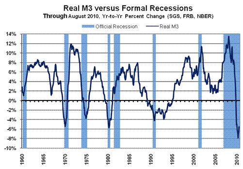 The second graph is the latest version of the year-to-year change in real M3 growth, where the series turning negative always has signaled an economic downturn or an intensifying recession. The downturn in December 2009 signaled the current re-intensification of the recession/depression.