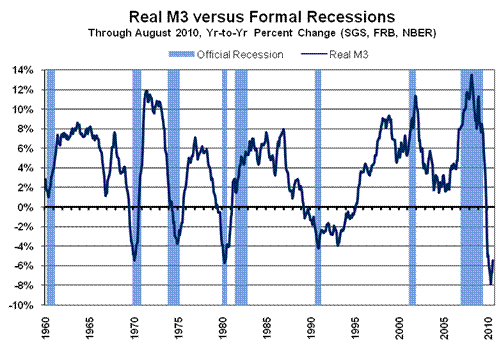 The signal for an economic downturn is independent of the depth or the duration of the annual contraction in real M3. A number of contractions have taken place without the M3 signal. M3 rising to the upside does not necessarily signal and economic upturn. Yet, every time annual growth in real broad liquidity turns negative, the economy follows.