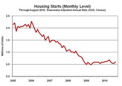 Since December 2008, as noted, housing starts have been bottom-bouncing at an historically low level, averaging a seasonally-adjusted annual rate of 571,800. In the past 21 months, all monthly readings have been within the normal range of monthly volatility for the series around that average, including August 2010’s reading of 598,000.