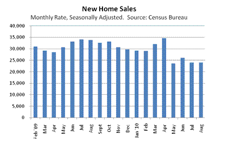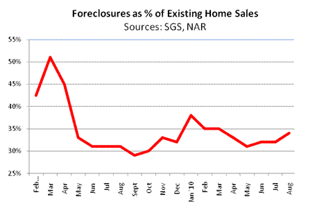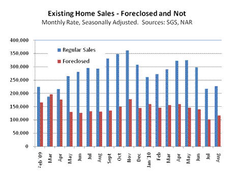Foreclosure activity remains a major distorting factor for home sales, with "distressed" activity accounting for 34% of existing sales in August, up from 32% in June and July. With other reporting showing foreclosures on the rise, and with forced or distressed sales not likely to soften in proportionate tandem with regular sales, one might expect that foreclosure levels will continue rise in the months ahead, at least as a portion of monthly sales. Separately, the Census Bureau acknowledges that a portion of new home sales also is from foreclosure activity but offers no estimates as to the scope of the issue. Some in the construction trade have difficulty competing with the pricing of foreclosed properties. Until the foreclosure problems get worked out in the system, monthly changes in these home sales numbers cannot be taken as meaningful positive indicators (when the numbers are positive) of underlying activity in homeowner real estate, as it relates to general economic activity.