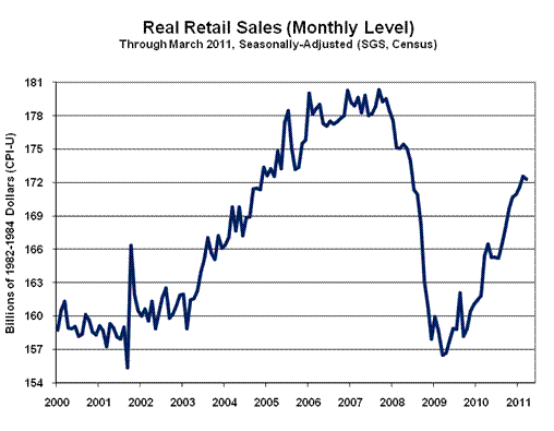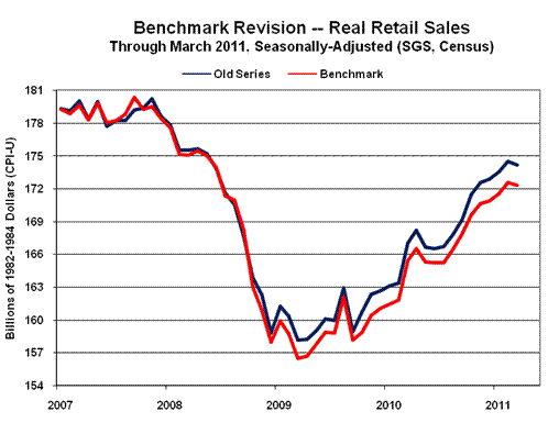 Retail Sales Benchmark Shows Weaker Recent Economic History. As shown in the accompanying graph, recent retail sales activity was lowered by roughly one-percent from previous reporting. Adjusted for inflation, real retail still troughed in March 2009, but at a level 1.05% below where it last had been estimated. The level of real retail sales for December 2010—peak of the holiday season—was revised lower by 1.15%, with the most recent March 2011 estimate revised lower by 1.10%.