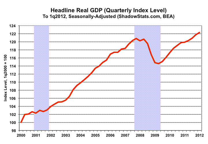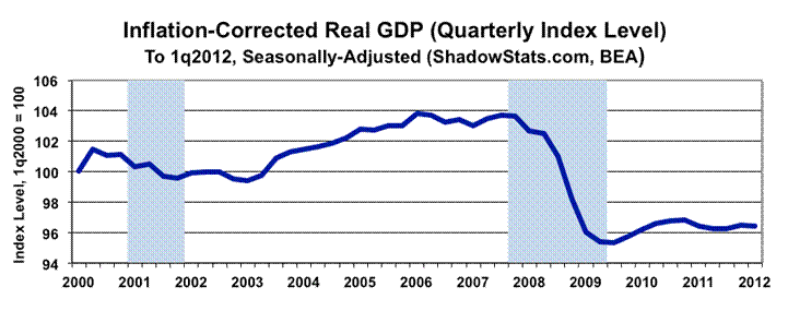 GDP. Published this morning, June 28th, by the Bureau of Economic Analysis (BEA), the third estimate (second revision) of first-quarter 2012 gross domestic product (GDP) showed real (inflation-adjusted) quarterly growth at a revised, statistically-insignificant 1.87% +/- 3% (95% confidence interval), effectively unchanged from the second estimate of 1.86%, and down from the initial estimate for the quarter of 2.20%. Fourth-quarter 2011 growth still is estimated at 2.95%. For each of the five quarters since first-quarter 2011, estimated growth rates have been little more than statistical noise around the unchanged level, and these heavily guessed-at numbers possibly have been massaged to keep the quarterly growth rates in minimally-positive, as opposed to minimally-negative territory.