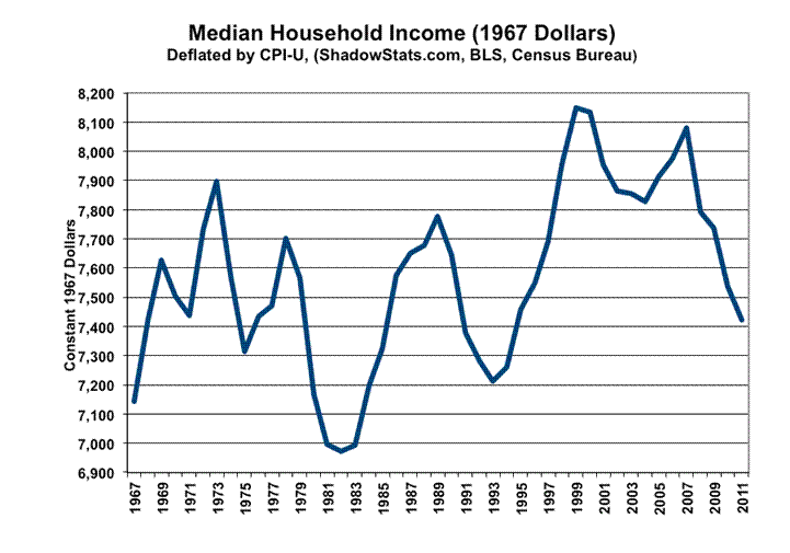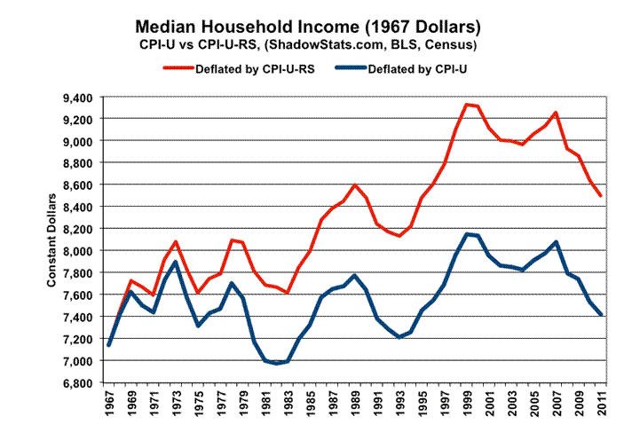 The difference in reporting is that traditional CPI-U deflation shows that the level of 2011 median household income is below where it was in 1969. These issues also are discussed more fully in the Hyperinflation Special Report (2011).
