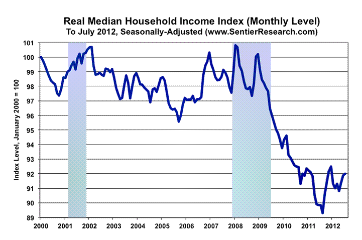 Monthly Real Median Household Income Continued Its Bottom-Bouncing in July 2012. The annual decline in real median household income in 2011 was consistent with the monthly real median household income numbers as published by www.SentierResearch.com. The Sentier numbers, which also are based on the Census Bureau’s monthly surveying, indicated the 2010 to 2011 annual decline. Shown in the following graph is the Sentier monthly household income index, updated through July 2012. The index has shown some slight bottom-bouncing to the upside so far in 2012.