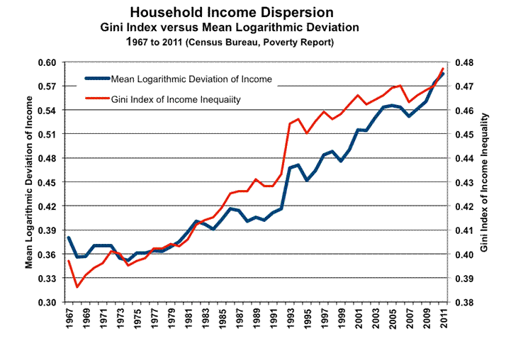 Shown in the following graph are the Gini Index of Income Inequality and the Mean Logarithmic Deviation of Income (MLD), two of the more popular income dispersion series. Some of the finer points and mathematics behind several of the income variance measures are covered in the Census Bureau’s article: The Changing Shape of the Nation’s Income Distribution.