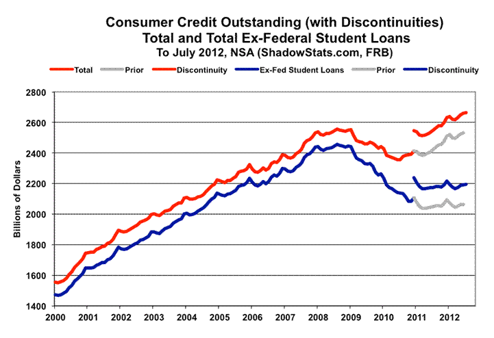 The July 2012 level of consumer credit outstanding was published by the Federal Reserve in the context of a discontinuity in the series introduced for December 2010, where the levels of aggregate consumer credit from December 2010 forward were shifted higher by 5.5%, which narrowed slightly to roughly 5.0% in the most recent reporting. Once again, this highlights the inability of the Fed to gather consistent and reasonably accurate information on a timely basis. The one-time upside shift in activity was due to a census of finance companies.