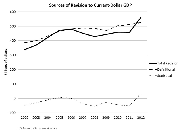 It shows simply that the basic statistical revisions (standard benchmark changes reflecting the availability of better-quality data) to the GDP in recent years were to the downside. Those effects, however, were heavily offset to the upside by the definitional changes.
