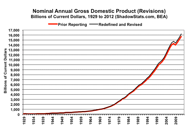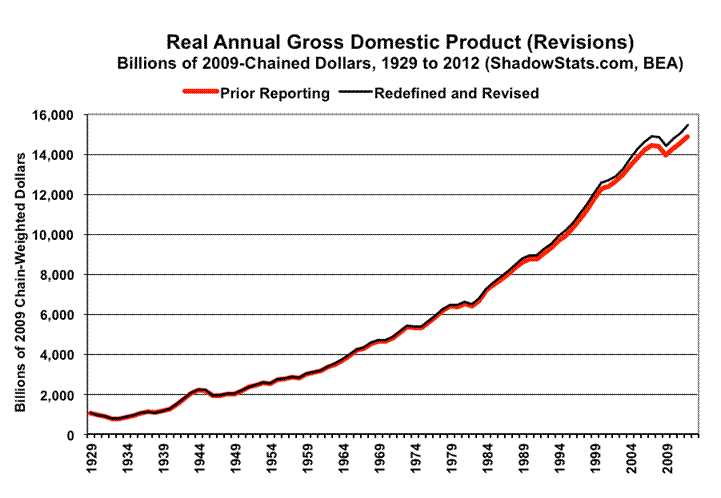 As has been discussed in the ShadowStats Primer Series on the GNP/GDP, varied academic theories, often with strong political biases, have been used to alter the GDP model over the years, resulting in “Pollyanna Creep,” where changes made to the series invariably have had the effect of upping near-term economic growth. Whether the change was to deflate GDP using “chain-weighted” instead of “fixed-weighted” inflation measures, to capitalize rather than expense computer software purchases, or to smooth away the economic impact of the September 11th terrorist attacks, upside growth biases have been built into reported GDP with increasing regularity since the mid-1980s. The 2013 revisions were unusually substantial, including capitalization of research and development costs, and literary and movie rights.