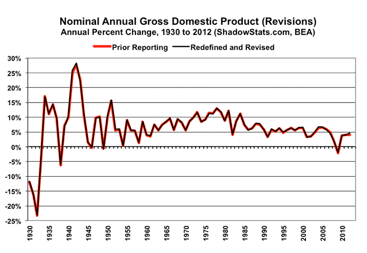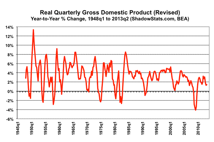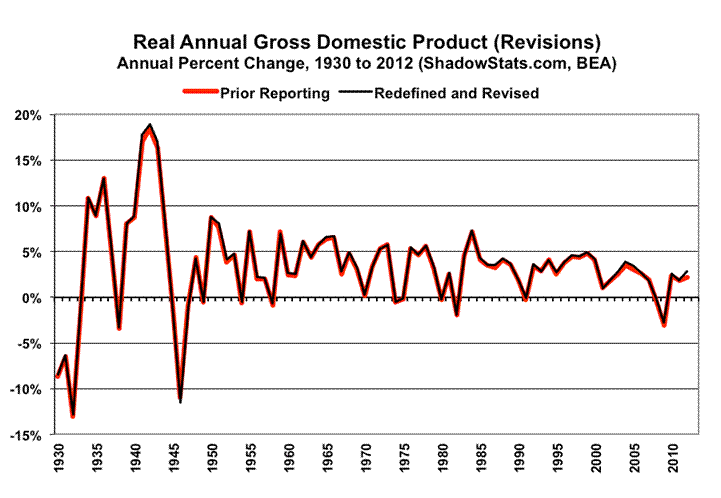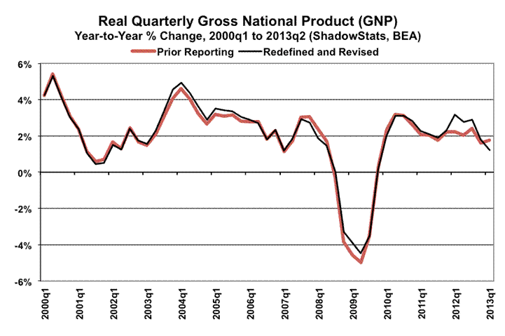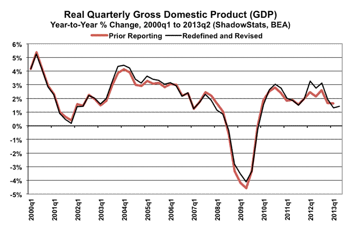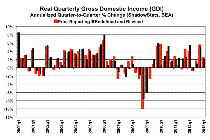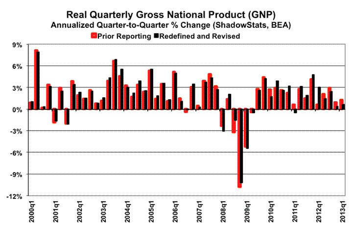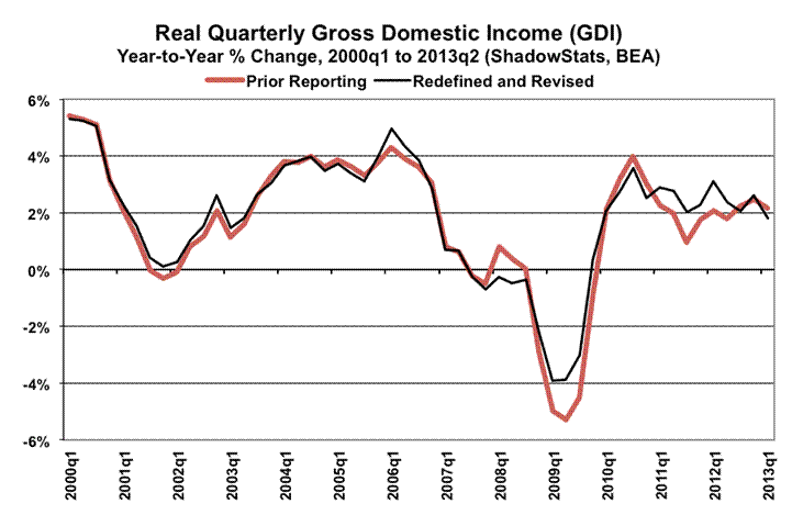 ShadowStats-Alternate GDP. The ShadowStats-Alternate GDP estimate for second-quarter 2013 is a 1.8% annual contraction, versus a headline year-to-year gain of 1.4%. The alternate first-quarter estimate remains 2.0% year-to-year contraction, versus the revised headline gain of 1.3%, which previously was 1.6% (see the Alternate Data tab).