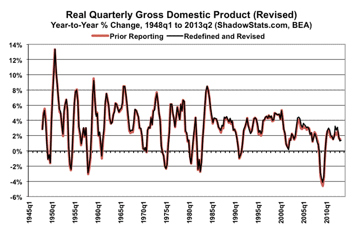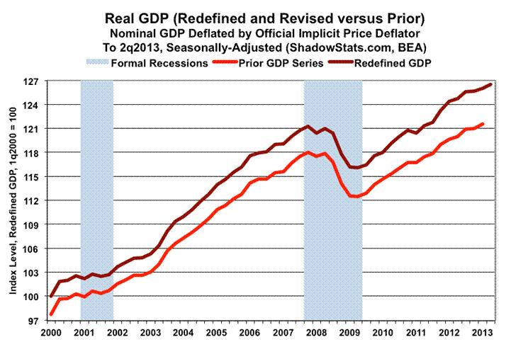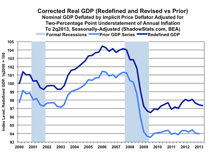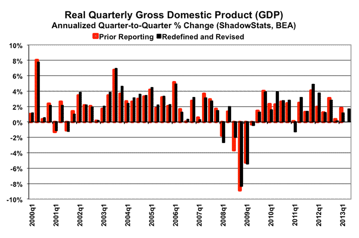 Continuing Pattern of Expanded Gimmicks Further Distorts GDP Reporting. The detail of the comprehensive benchmark revision to gross domestic product (GDP) and related reporting, released along with the first estimate of second-quarter 2013 GDP by the Bureau of Economic Analysis (BEA), on July 31st, is covered in the Opening Comments section. As a result of those revisions, historical GDP reporting has moved increasingly away from underlying real-world economic activity and common experience. Despite even greater understatement of GDP inflation (overstatement of inflation-adjusted growth), the revised GDP detail shows relatively-weak, recent quarterly headline growth in conjunction with a sharp slowing in year-to-year growth for the series.Nonetheless, in the context of the revisions, the GDP remains the only major economic series to show a full economic recovery and meaningful, renewed expansion, since the onset of official recession in December 2007. Based on new reporting, second-quarter 2013 GDP was at 4.4% above the pre-recession GDP peak activity, designated as fourth-quarter 2007. With common experience and the vast bulk of other economic data showing no recovery, the headline upswing in GDP activity, since mid-2009, has been no more than a statistical illusion created by the use of bad-quality inflation data.