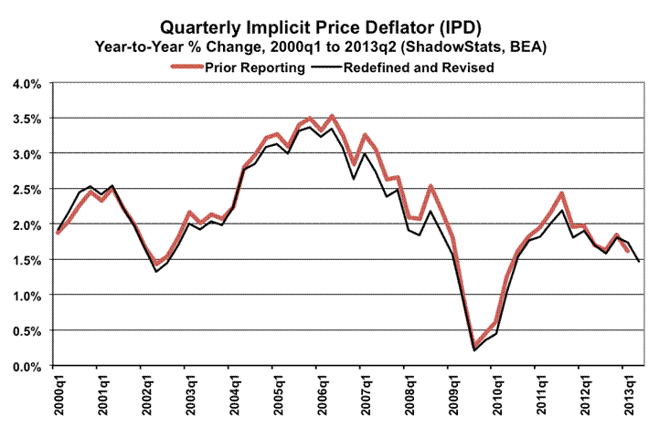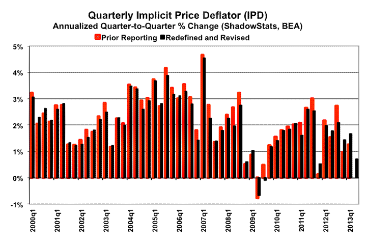 Implicit Price Deflator (IPD). Second-quarter 2013 GDP inflation, or the implicit price deflator was reported at an annualized pace of 0.71%, versus a revised 1.67% (pre-benchmark 1.26%) in the first-quarter. Year-to-year, second-quarter 2013 IPD inflation was 1.47%, versus a benchmark-revised 1.74% (previously 1.62%) in the first-quarter. For comparison purposes, the annualized seasonally-adjusted quarterly inflation for the CPI-U in second-quarter 2013 was a 0.03% contraction, versus 1.44% positive inflation in first-quarter 2013, with year-to-year second-quarter 2013 CPI-U (unadjusted) at 1.39%, versus 1.68% in the first-quarter.