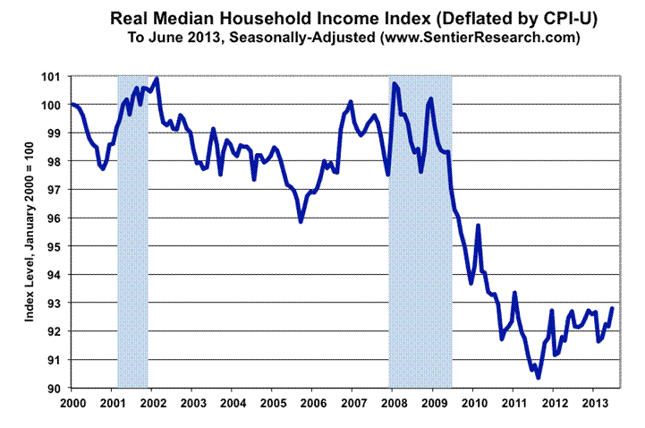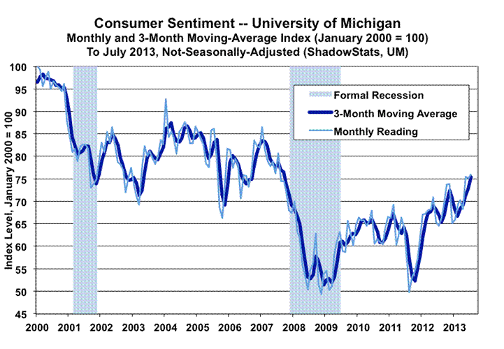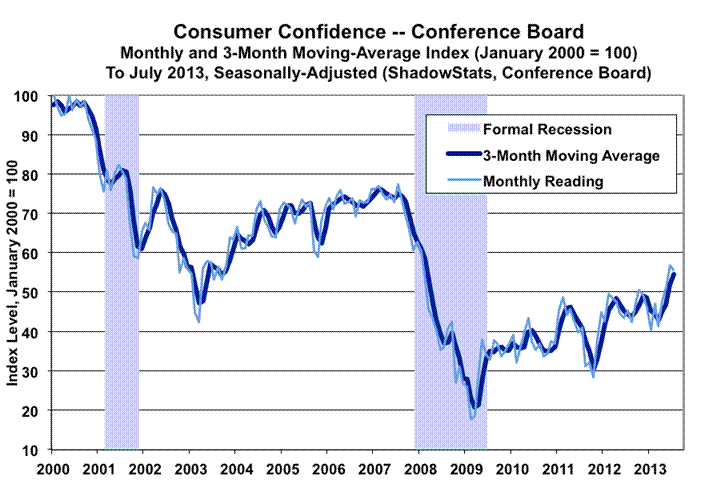 Other reporting—tied to consumer conditions—has continued to signal a liquidity-strapped consumer, who is unable to support sustained growth in broad consumption. As a result, the post-2009 recovery hyped by the government and Wall Street never took place, and the hoped-for recovery still is not pending. Related plots on June 2013 real median household income and on July consumer confidence and sentiment are shown at the end of the Opening Comments.