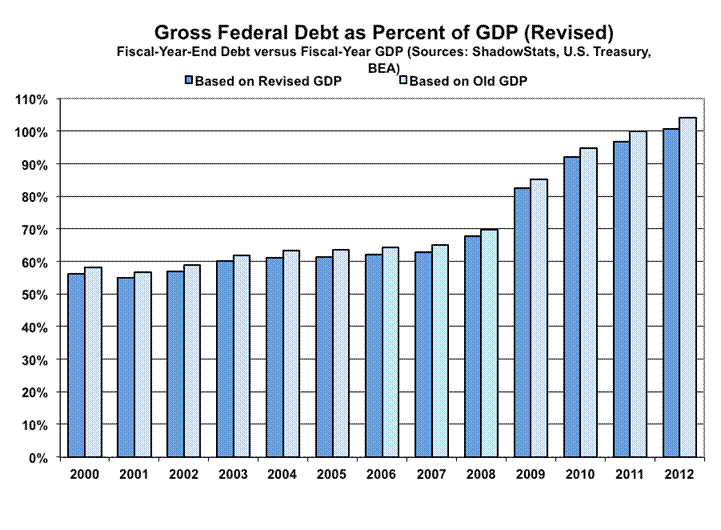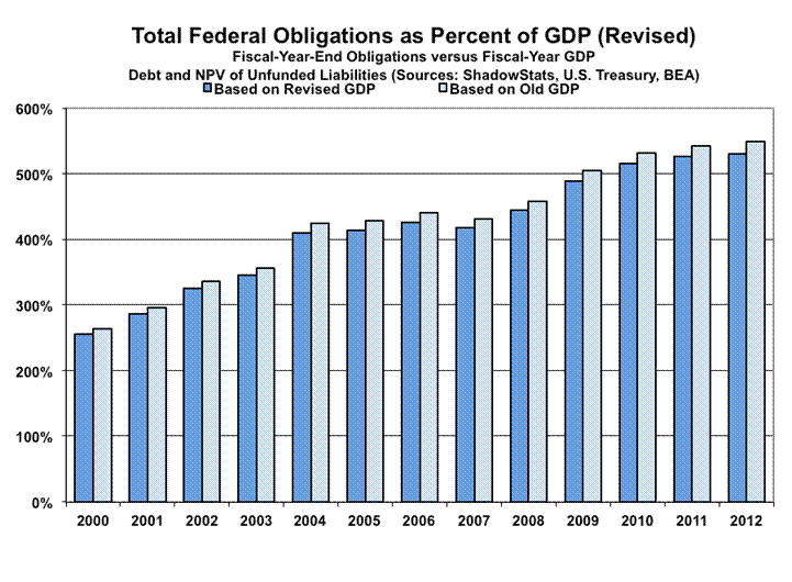 Indeed, ongoing and deepening economic woes assure that the usual budget forecasts—based on overly-optimistic economic projections—will fall far short of fiscal balance and propriety. Chances also remain nil for the government fully addressing the GAAP-based deficit that hit $6.6 trillion in 2012, let alone balancing the popularly-followed, official cash-based accounting deficit that was $1.1 trillion in 2012 (see No. 500: Special Commentary).