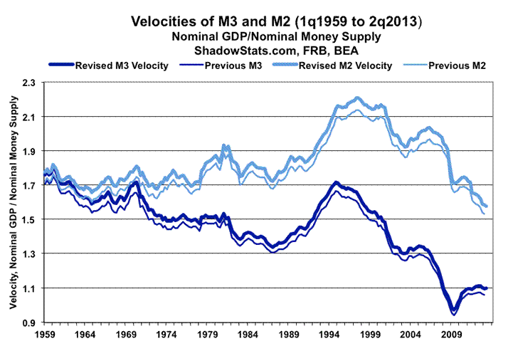 Revised Money Supply Velocity. Incorporating today’s nominal data on second-quarter 2013 GDP, as well the comprehensive historical revisions to the GDP, updated estimates of money velocity for money supply M2 and M3 are graphed below. The decline seen in first-quarter 2013 velocity continued in second-quarter 2013 for M2, but velocity ticked higher for M3 (using the ShadowStats Ongoing-M3 Measure), as shown in the accompanying graph.