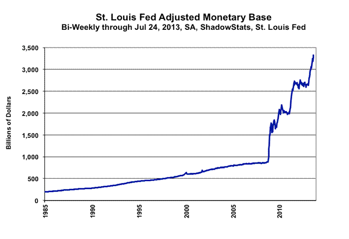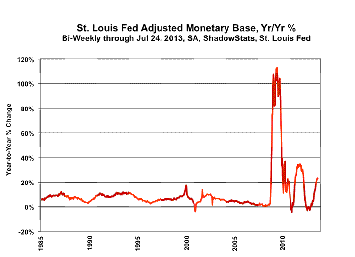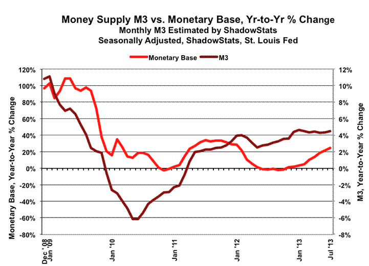 The Fed’s recent and ongoing liquidity actions themselves suggest a signal of deepening problems in the financial system. Mr. Bernanke admits that the Fed can do little to stimulate the economy, but it can create systemic liquidity and inflation. Accordingly, the Fed’s continuing easing moves appear to have been primarily an effort to prop-up the banking system and also to provide back-up liquidity to the U.S. Treasury, under the political cover of a “weakening economy.” Mounting signs of intensifying domestic banking-system stress are seen in soft annual growth in the broad money supply, despite a soaring pace of annual growth in the monetary base, and in global banking-system stress that followed the crisis in Cyprus and continuing, related aftershocks.