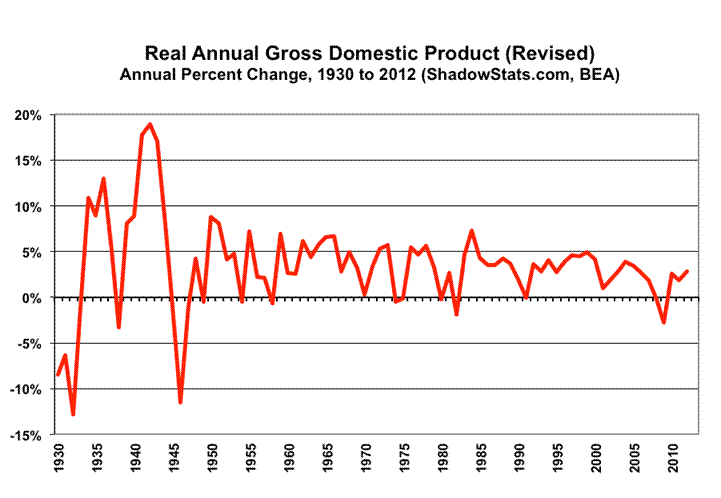 The second graph reflects the revised average annual growth of real GDP back through the first annual growth reading of the series in 1930. The revised near-term trough in annual change in 2009 of a 2.80% contraction (previously a 3.07% contraction), remained the deepest annual contraction since a revised 11.59% (previously 10.94%) post-World War II plunge in activity, in 1946, as war production was shut down. Shy of the war effects, the 2009 annual GDP contraction was the steepest since the Great Depression.