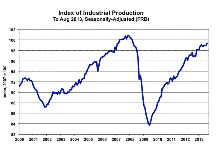 Industrial Production—August 2013. The Federal Reserve Board released its estimate of seasonally-adjusted, August 2013 industrial production this morning, September 16th. In the context of minor upside revisions to the prior six months of production activity (the period open to revision), headline monthly August production activity was up by 0.4% (0.41% at the second decimal point), up by 0.42% before prior-period revisions. The August gain was against an unrevised “unchanged” July, at the first decimal point. At the second decimal point, July was down a revised 0.03%, versus a previous 0.04% monthly gain.