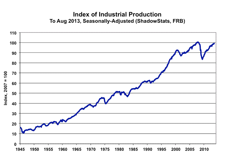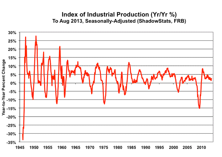 Industrial Production—August 2013. Consistent with recent stagnation and/or renewed monthly downturn seen in broad business activity, the 0.4% monthly increase in August industrial production was well within the normal volatility of the series. Separately, year-to-year production growth had slowed to 1.4% in July 2013, a pattern and level last seen in mid-2008, which was well into the early stages of the formal 2007 recession. In August 2013, annual growth rebounded to 2.7%, but that growth pickup was due primarily to comparative August 2012 activity having been depressed by Hurricane Isaac. Allowing for that circumstance—in normal economic times—the current pattern of year-to-year growth would be consistent with a new recession that already was underway.