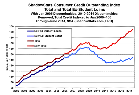 The first two graphs following show real median household income through June 2014, based on numbers provided by www.SentierResearch.com, and consumer credit outstanding, as updated by the Federal Reserve for June 2014.