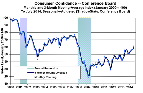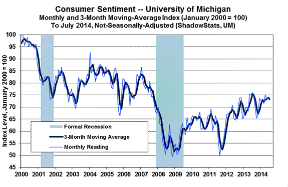 The third and fourth graphs following reflect the final July 2014 reporting of the ever-volatile consumer confidence (Conference Board) and consumer sentiment (University of Michigan) indices. Current levels for both series remain deep in traditional-recession territory, despite a one-month spike in the confidence measure, and despite the latest sentiment number moving in the opposite direction. The patterns with these series, as with household income, have been of collapse and stagnation, since 2007, as opposed to the pattern of economic collapse and recovery indicated in the heavily-distorted GDP series, as seen at least through its fourth-quarter 2013 reporting.