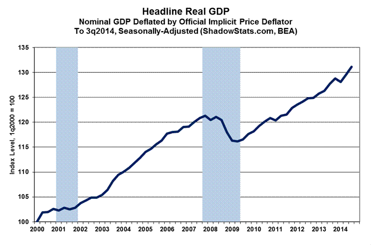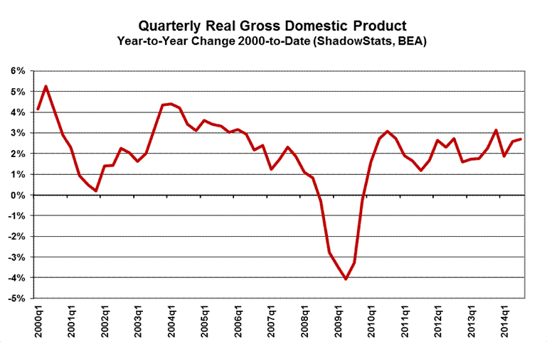 ShadowStats-Alternate GDP. The ShadowStats-Alternate GDP estimate for third-quarter 2014 GDP remained a 1.7% year-to-year contraction (-1.7%) versus the revised headline third-quarter GDP gain of 2.7% (previously 2.4%, initially 2.3%). Those third-quarter 2014 estimates were against a similar ShadowStats estimated 1.7% (-1.7%) year-to-year contraction but a headline year-to-year gain of 2.6% in second-quarter GDP (see the Alternate Data tab).