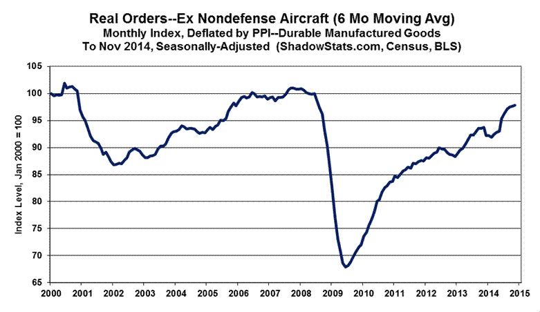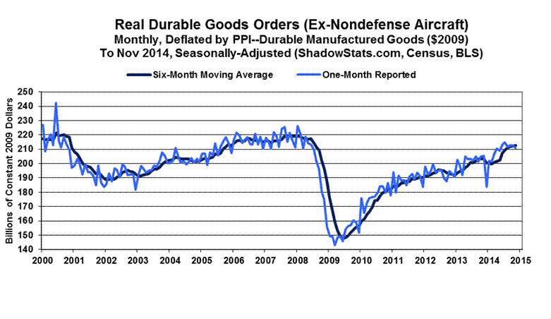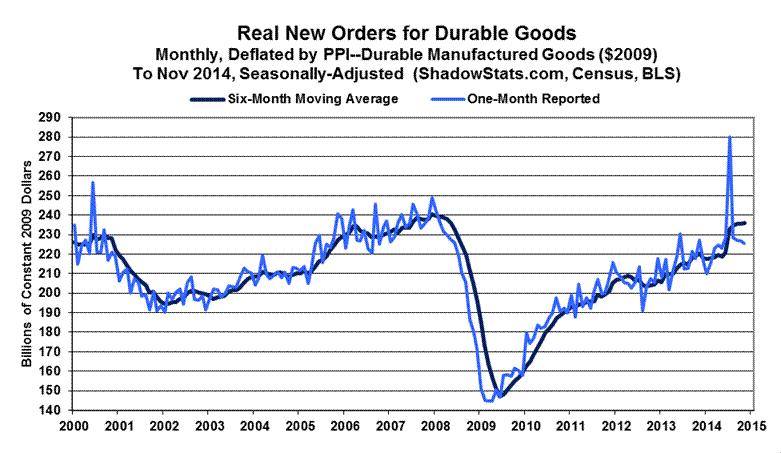 Real (Inflation-Adjusted) Durable Goods Orders—November 2014. ShadowStats uses the PPI aggregated inflation measure "Durable Manufactured Goods" for deflating the new orders for durable goods series. Published only on a not-seasonally-adjusted basis, the related PPI series reflected a headline negative 0.06% (-0.06%) pace of inflation in November, following a positive 0.42% monthly pace of inflation in October, with headline annual inflation at 1.15% in November 2014, versus 1.33% in October.