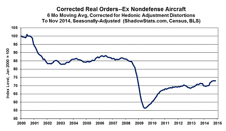 In terms of inflation-adjusted activity, both of these series have shown a slowing uptrend and flattening-out in the last two-to-three years—with a dip and upside bouncing into 2013, and renewed stagnation in recent reporting, feeding into the temporary July surge. Broadly, there has been a recent general pattern of stagnation or bottom-bouncing evident in the orders—clearly not the booming recovery that has been seen in official GDP reporting. The real (inflation-adjusted) six-month moving-average level of new orders in November 2014, even allowing for the extraordinary July surge in aircraft orders, remained at or below the pre-2007 recession high, and below the pre-2000 recession high, ex-commercial aircraft. The pattern of recent stagnation turning to a downtrend in the inflation-adjusted series—net of the irregular aircraft-order effects, also is one that commonly precedes or is coincident with a recession.