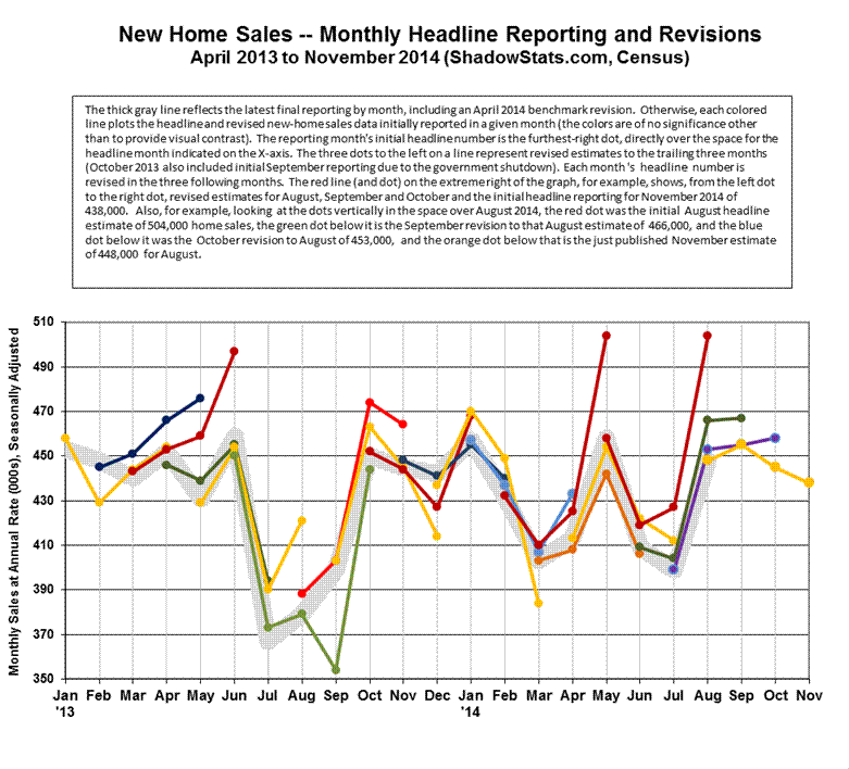 New-Home Sales—November Sales Declined Month-to-Month and Year-to-Year, on Top of Prior-Period Downside Revisions. A lack of reporting stability continued with the Census Bureau’s headline, reporting of November 2014 new-home sales. As shown in the accompanying revised graph of New-Home Sales Reporting and Revisions, headline reporting remained unstable, with the latest headline reporting taking a series of softening uptrends into a downtrend. The headline 1.6% (-1.6%) monthly decline in November sales would have been a drop of 6.6% (-6.6%), but for the downside revision to October’s headline data.