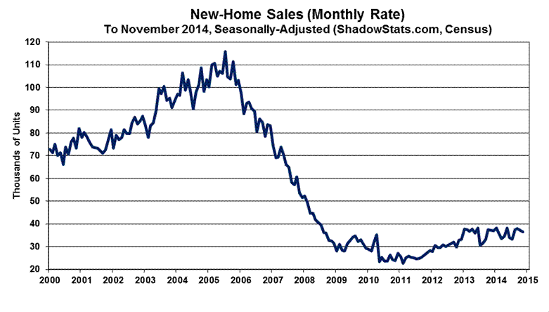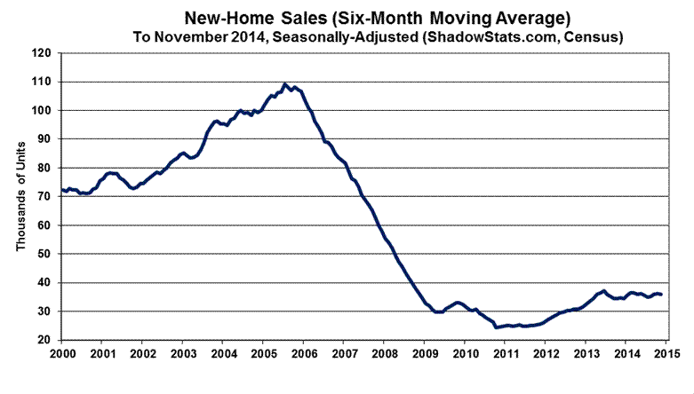 Graphed either way, the various housing series continue to show a pattern of economic activity plunging from 2005 or 2006 into 2009, and then stagnation, with the stagnation continuing at a low level of activity to date. Housing never recovered with the GDP reporting. Headline November 2014 new-home sales activity still was down by 68.5% (-68.5%) from the pre-recession peak of July 2005, while November single-unit housing starts were down by 62.9% (-62.9%) from the January 2006 high of that series. As discussed further in the Opening Comments, there has been no underlying improvement in fundamental consumer liquidity conditions. Correspondingly, there has not been a basis here for a recovery, past, present or pending, in the housing market.
