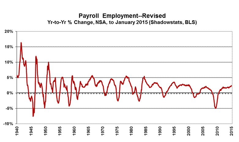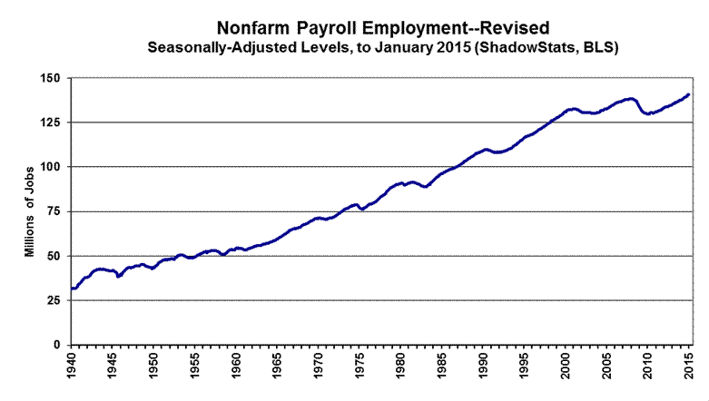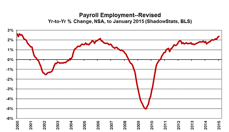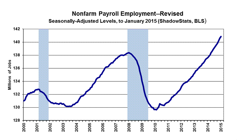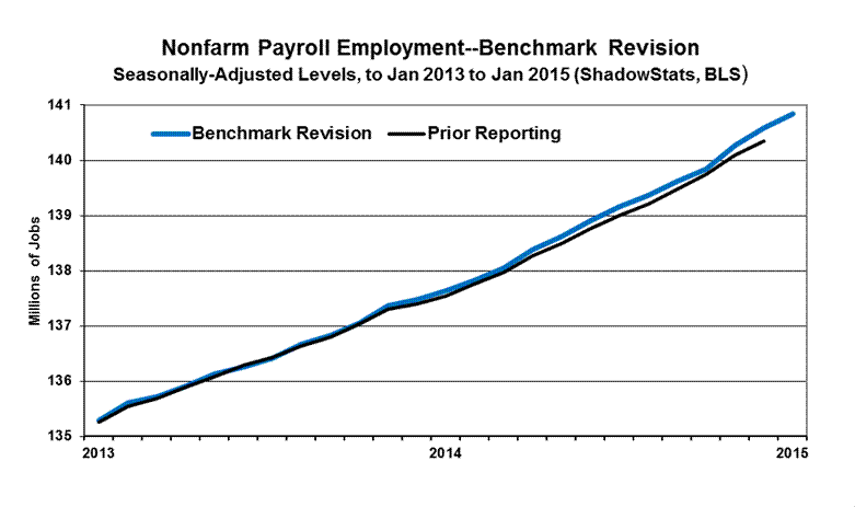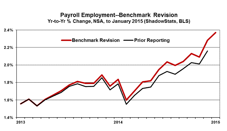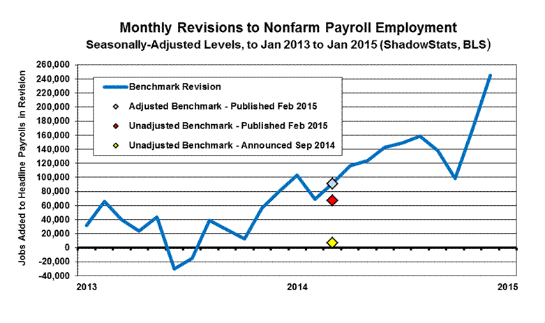 This Commentary concentrates on detail from the headline reporting of the January 2015 labor data, and the annual benchmark revision to payrolls and the annual resetting of the population parameters in the household survey. It also covers the initial estimate of year-to-year growth in the ShadowStats Alternate M3 Measure for December 2014 (see the Hyperinflation Watch section).