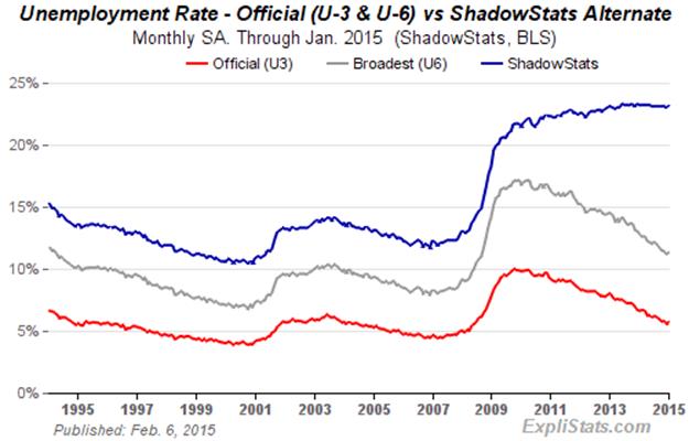 January 2015 Unemployment: 5.7% (U.3), 11.3% (U.6), 23.2% (ShadowStats)
